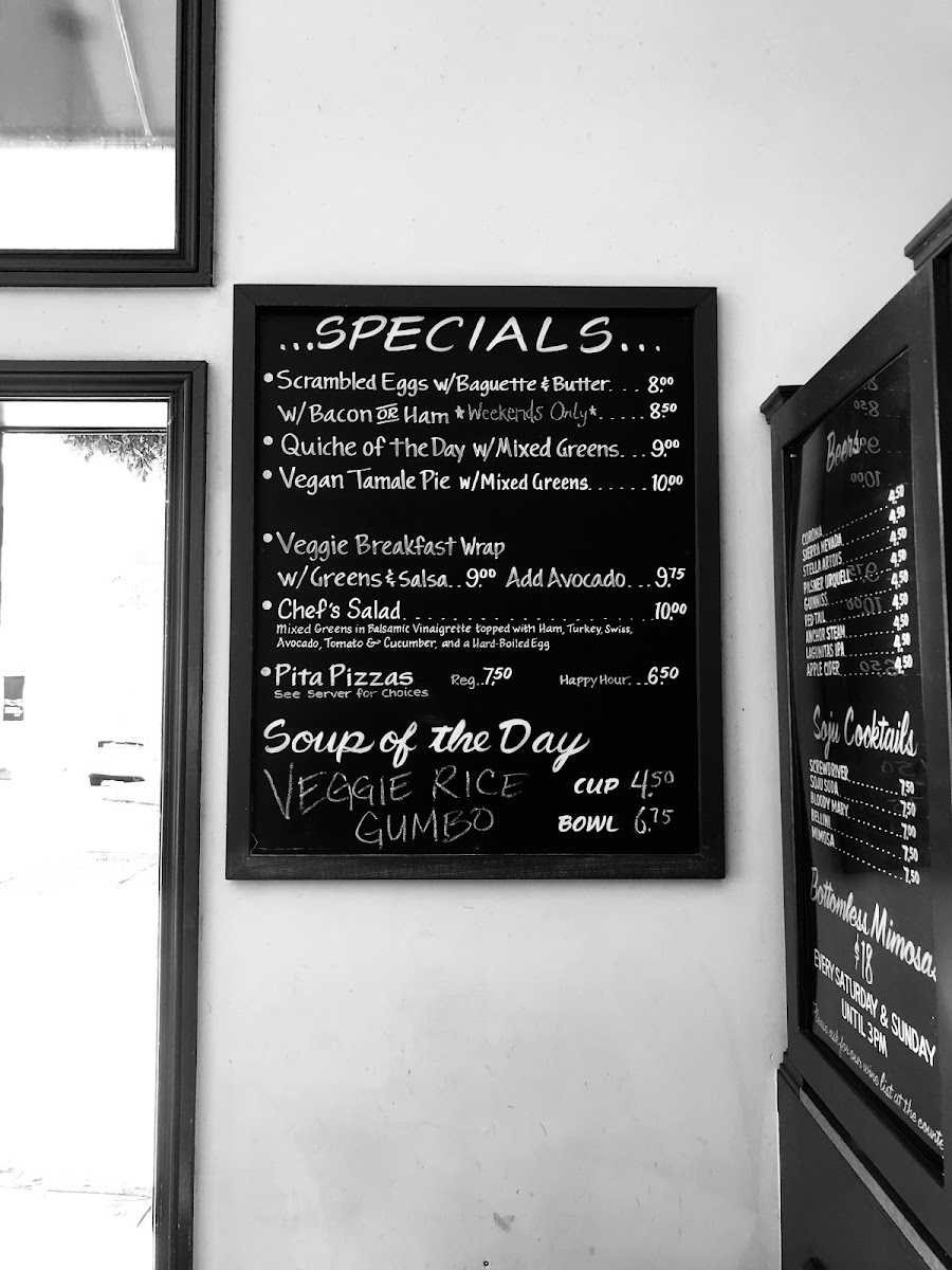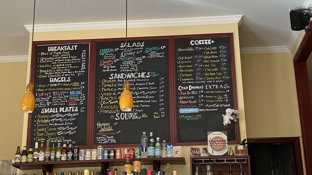 Food items are organized around breakfast dishes, light salads, sandwiches, and small plates. Breakfast selections include scrambled eggs with baguette, veggie breakfast wraps with greens and salsa, and bagels served with scrambled eggs and avocado. For lighter meals, the menu features options such as arugula salad, chicken Caesar salad, chef’s salad with ham, turkey, and Swiss cheese, as well as vegan lentil soup and homemade hummus.